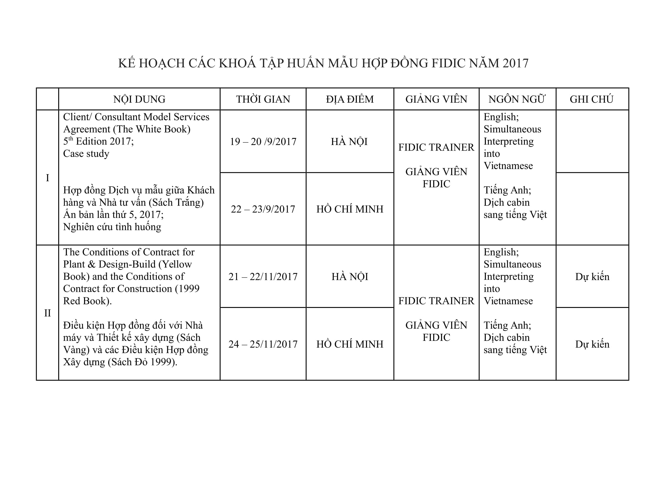 KẾ HOẠCH CÁC KHOÁ TẬP HUẤN MẪU HỢP ĐỒNG FIDIC NĂM 2017-1